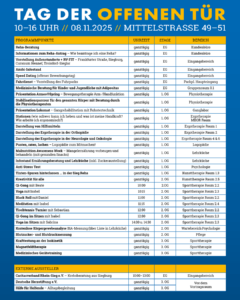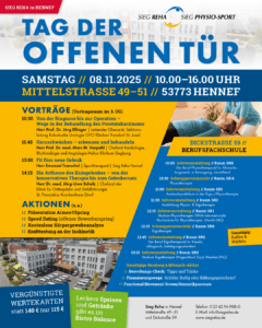 Auch unsere Berufsfachschule in der Dickstraße 59 öffnet an diesem Tag ihre Türen. Dort finden zahlreiche Infoveranstaltungen zu den Berufsbildern Physiotherapie und Ergotherapie sowie zu Studienmöglichkeiten im In- und Ausland statt.